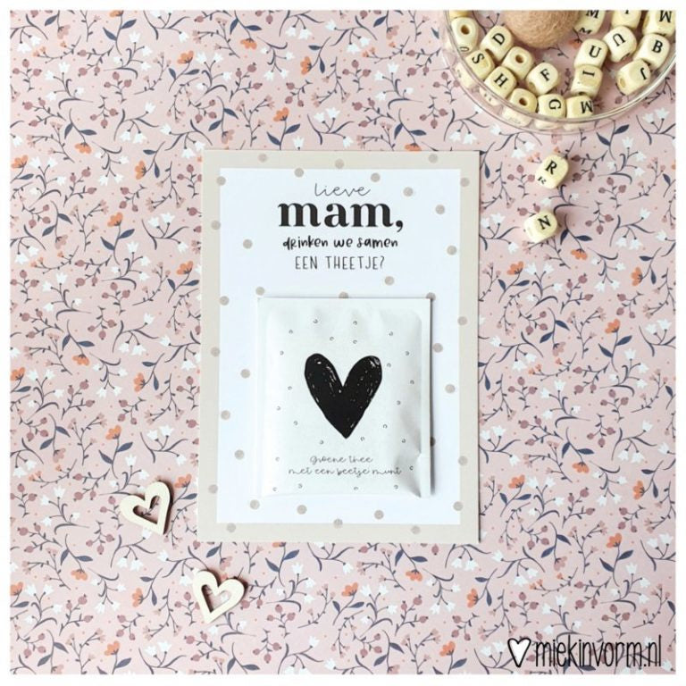 Voor op de kaart zit een theezakje met de smaak “groene thee met een beetje mint’.